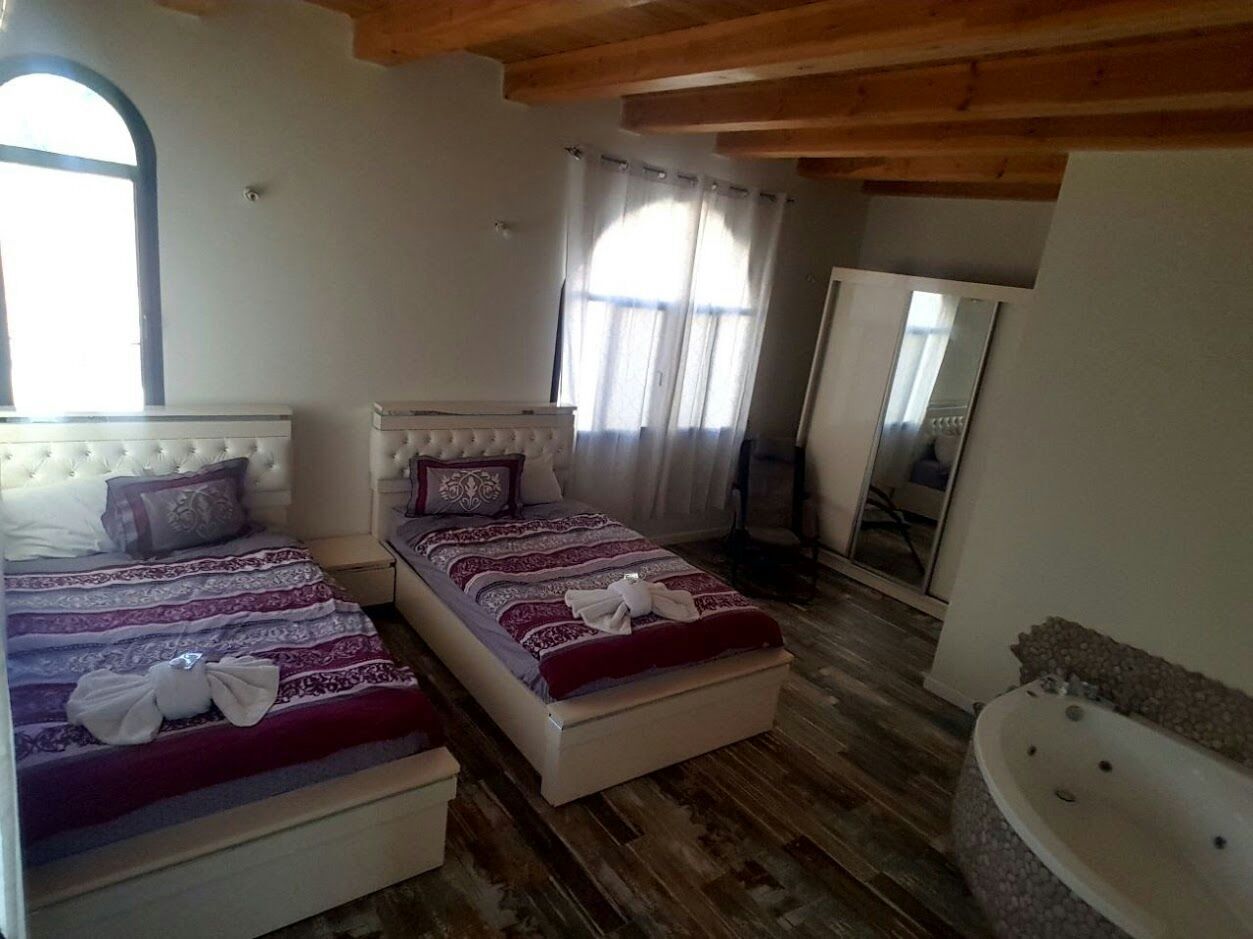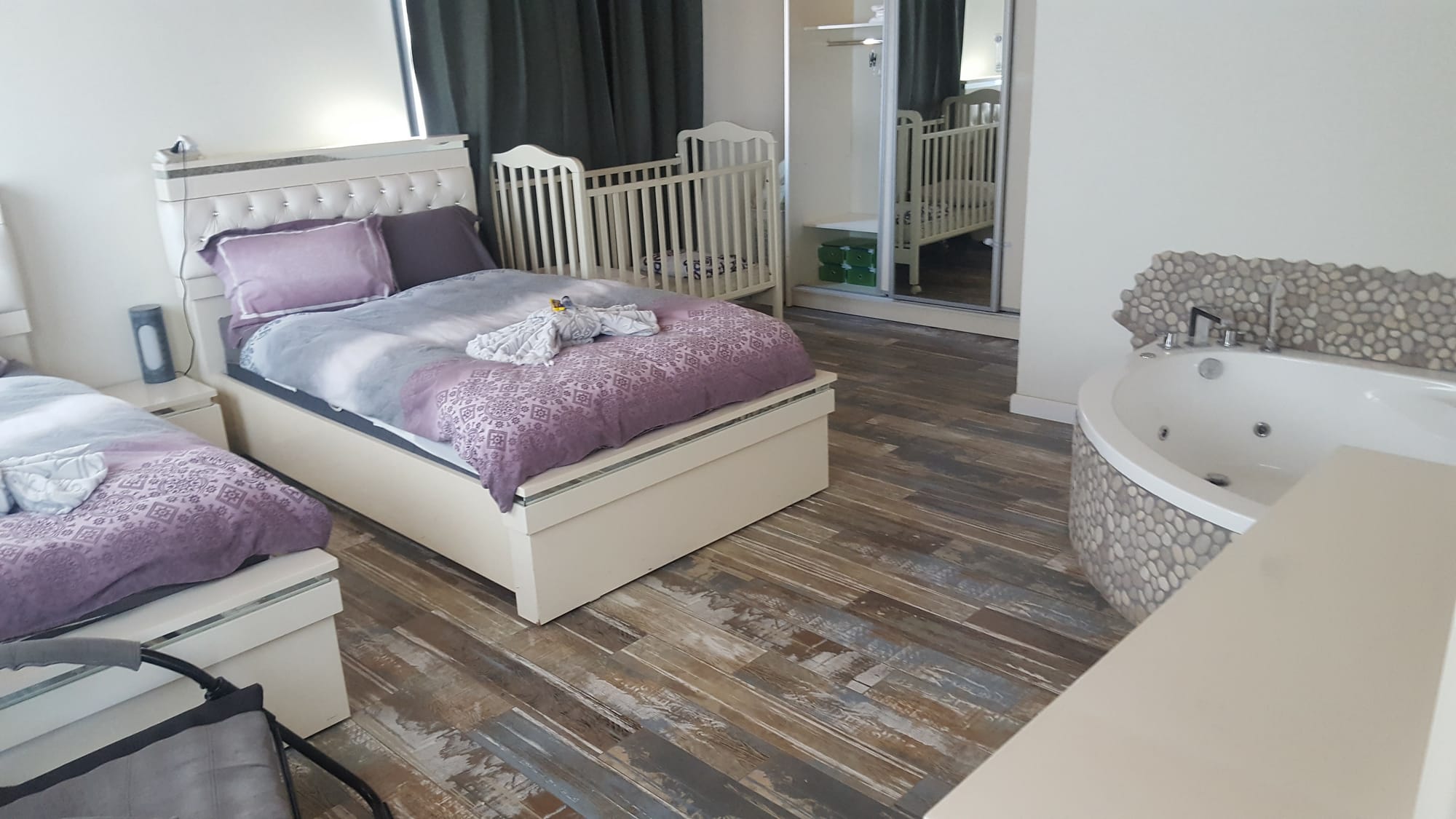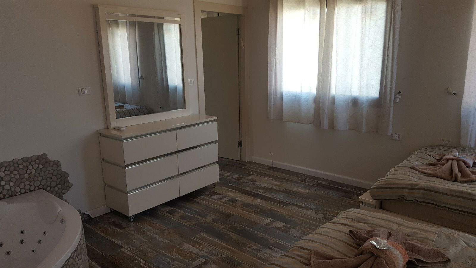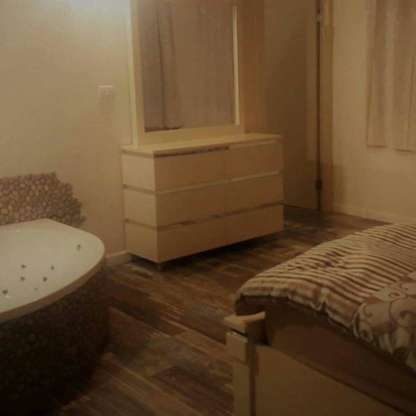 בסוויטה יש שני חדרים (חדר בתוך חדר) החדר הפנימי כולל 2 מטות גדולות במיוחד (1.20 רוחבה של כל מיטה - אצלכם בבית זה 90 גג), שרותים ומקלחת, ג'קוזי, סאונה יבשה, מתקן מסאז' לרגליים וכורסת מסאז' שמישהו הרס וחבל (מחול מחול מחול).